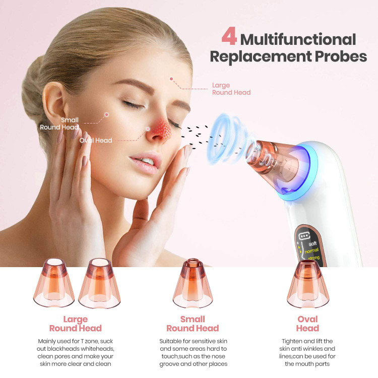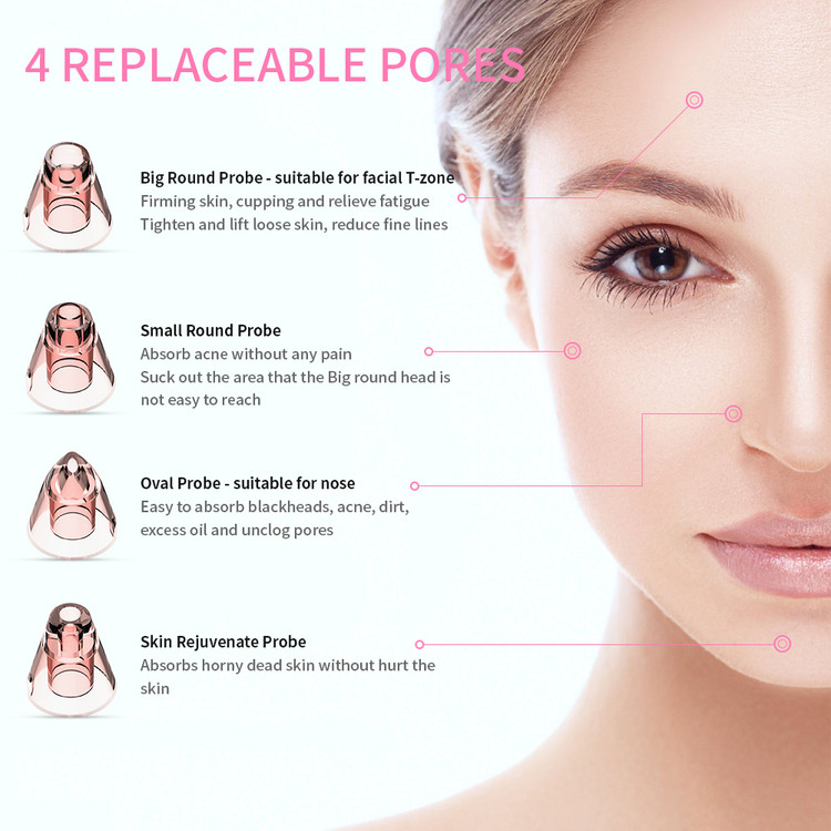 پاککننده جوشهای سرسیاه شامل پروب گرد بزرگ برای تمیز کردن آلودگی روی گونهها و پیشانی، پروب گرد کوچک برای از بین بردن جوشهای سرسیاه اطراف بینی، پروب بیضی برای لیفت کل صورت و پروب تمیزکننده عمیق برای لایهبرداری سلولهای مرده پوست.